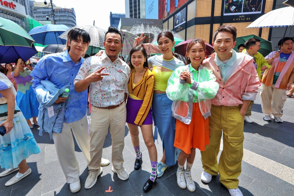 (左起)Daniel 黄震宇、林德荣、Yoon吴家润、Emely 潘毖伶、颜薇恩、Jack叶朝明在大热天下敬业拍摄。