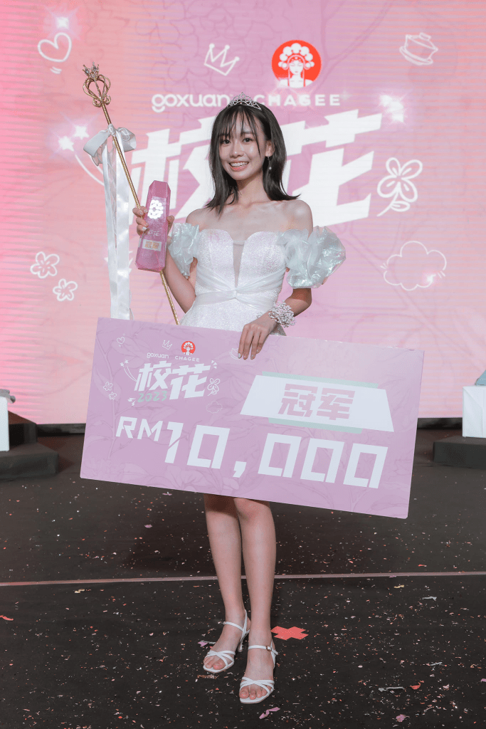 备受瞩目的最美校园企划《GOXUAN CHAGEE校花 2023》在Sunway Pyramid天台停车场迎来‘冠军出道夜’。来自Catherine凯心组的连怡柔(18岁,槟城)呼声最高,在比赛种表现亦最为亮眼,尤其在采访校花鉴赏人(评审)互动的‘聊天秀’环节以机智且有条理的逻辑思维获得评审一致好评,大热夺冠,赢取1万令吉现金奖、GOXUAN 周末MC 合约以及签约成为CHAGEE新品推荐官,原地出道!