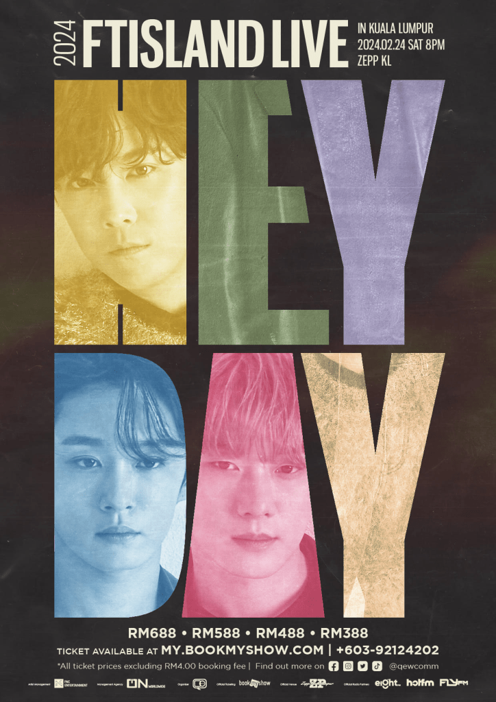 《2024 FTISLAND LIVE ‘HEY DAY’ IN KUALA LUMPUR》演唱会门票将于11月30日,(星期四) ,中午12时在 my.bookmyshow.com 及热线 +603-92124202 开卖。