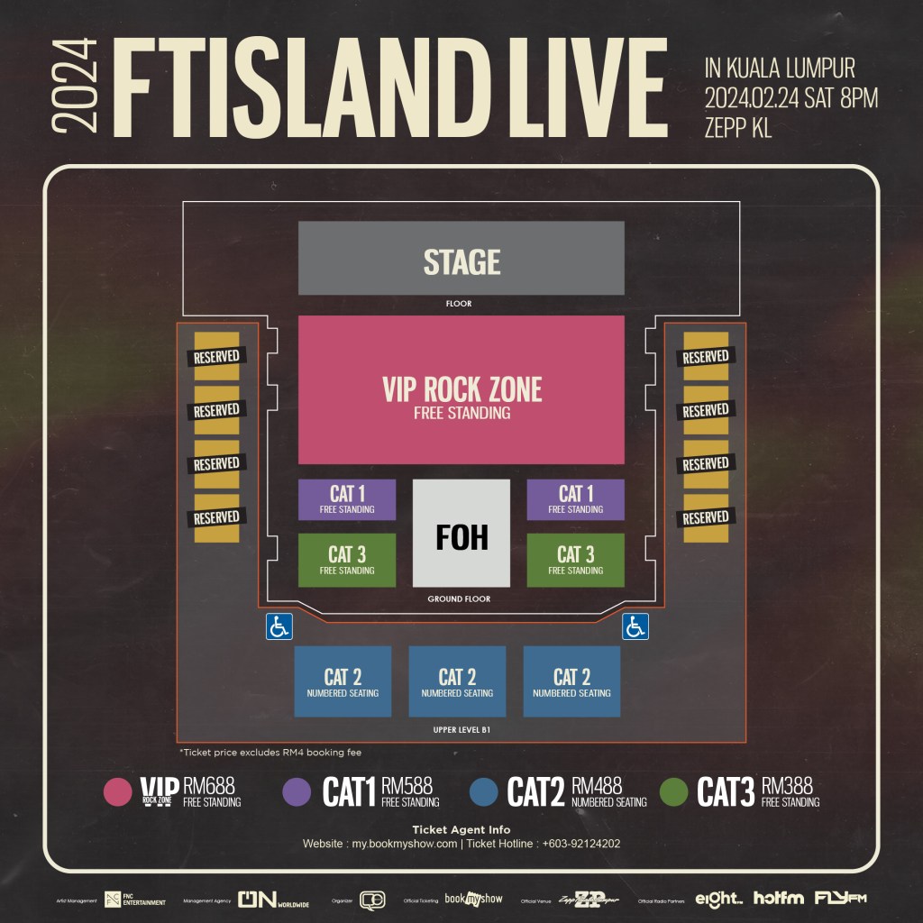 演唱会门票将于2023年11月30日(周四),中午12 时在 my.bookmyshow.com 及热线 +603-92124202 开卖,票价分别为 688令吉(VIP 摇滚区站位)、588令吉(CAT 1 站位)、488令吉(CAT 2 坐位 )以及388令(CAT3 站位),票价不包括4令吉手续费,以及每人最多能购买6张门票。