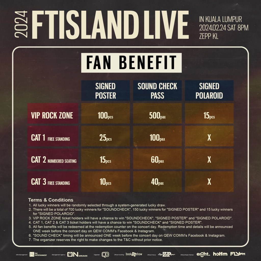 另外,FTISLAND这次也推出多项限量福利套组,购买VIP门票的观众,有机会可赢得彩排福利入场券(共500位)、亲笔签名海报(共100张)以及亲笔签名拍立得(共15张)。