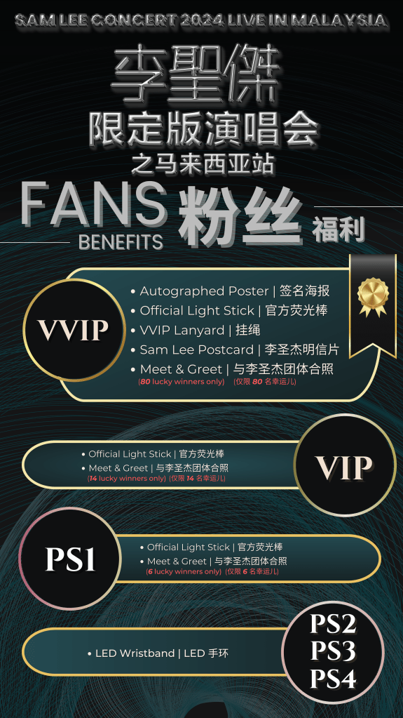 票价分为:RM 1188(VVIP)、RM 898 (VIP)、RM 698(PS1)、RM 498(PS2)、RM 368(PS3)及 RM 238(PS4)。所有票价不含RM 4手续费,每种票价均附送粉丝福利。