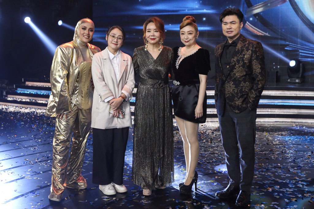 总决赛舞台评审阵容评审(左起)本地实力女唱将Shila Amzah茜拉、Astro中文电台内容总监丘咏欣、台湾疗伤歌后辛晓琪、常驻评审郭燕燕和经典熟脸孔郑国亮。