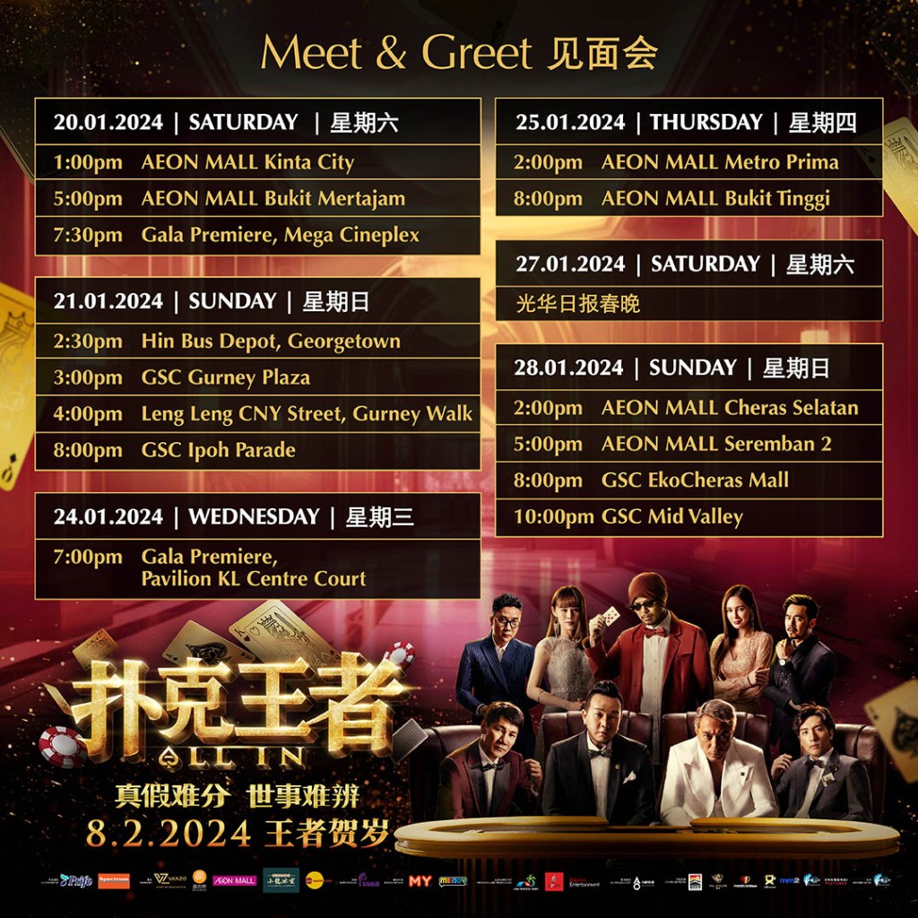 贺岁片《扑克王者》的巡回宣传将于 1 月 20 日正式开跑!众演员除了会陆续在槟城、霹雳、雪隆和森美兰州各区出现与影迷们见面、玩游戏、送奖品外,更会惊喜的现身于多个电影优先场向影迷们见面谢票。