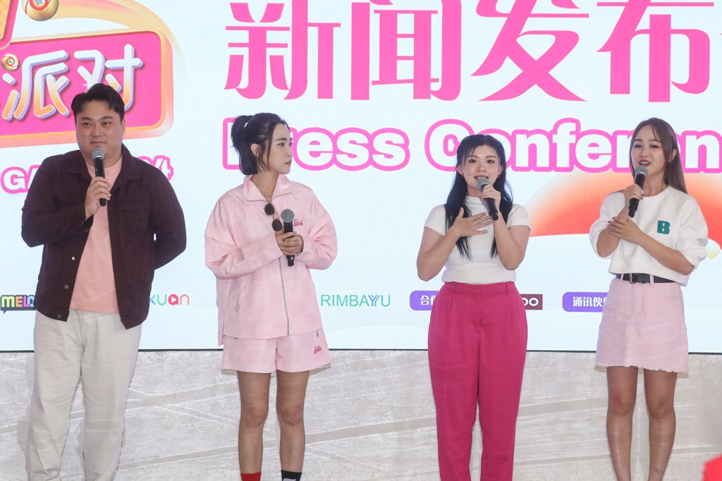 由林德荣主持的派对节目”龙争虎斗“获一众参与节目的艺人开心表示今年节目无需彩排演练 。左起为温慧茵、陳薇芝及林德荣。