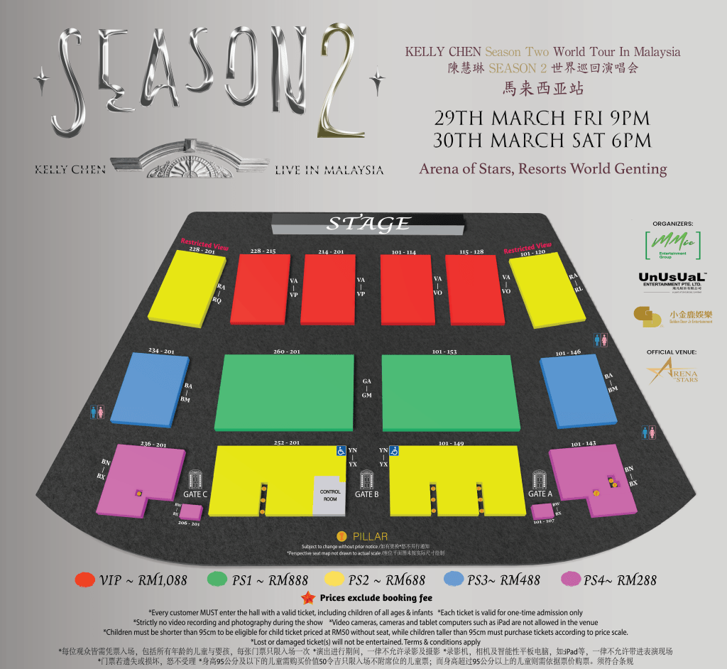 🎫票价:RM1088(VIP)、RM888(PS1)、RM688(PS2)、RM488(PS3)、RM288(PS4)