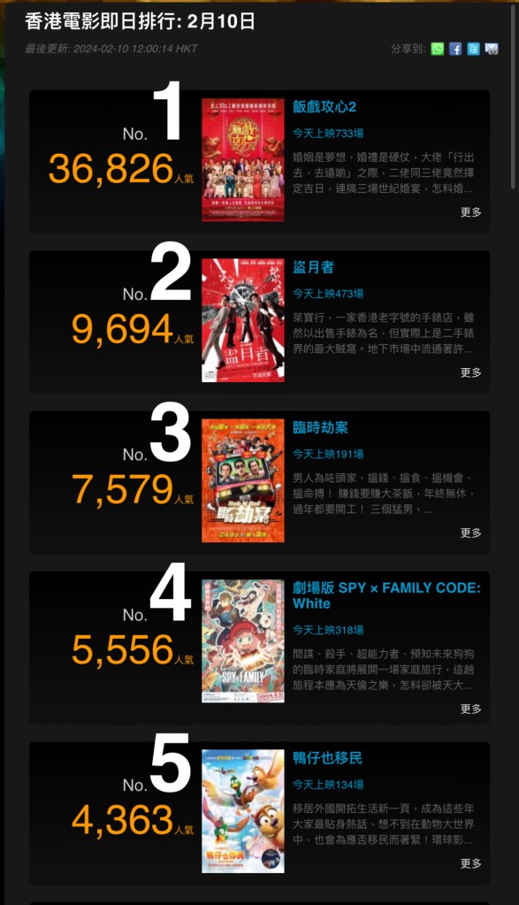 截至上映首日下午5时,《饭戏攻心2》票房冲破港币216万(约马币132万),已远超上集《饭戏攻心》首日总票房以及同期电影,荣登香港电影人气榜冠军![]()