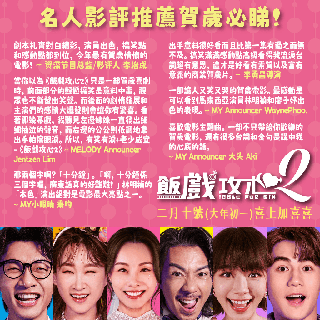 《饭戏攻心2》日前于大马吉隆坡办了首映礼大获好评,包括本地导演、艺人主播等在内的观影者纷纷赞好,表示电影欢笑满溢又赚人热泪。