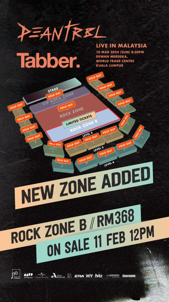 为了感谢大家的热烈支持,[ #DEAN with #Tabber Live in Malaysia]将会新增区域(ROCK ZONE B, RM368)供抢购。