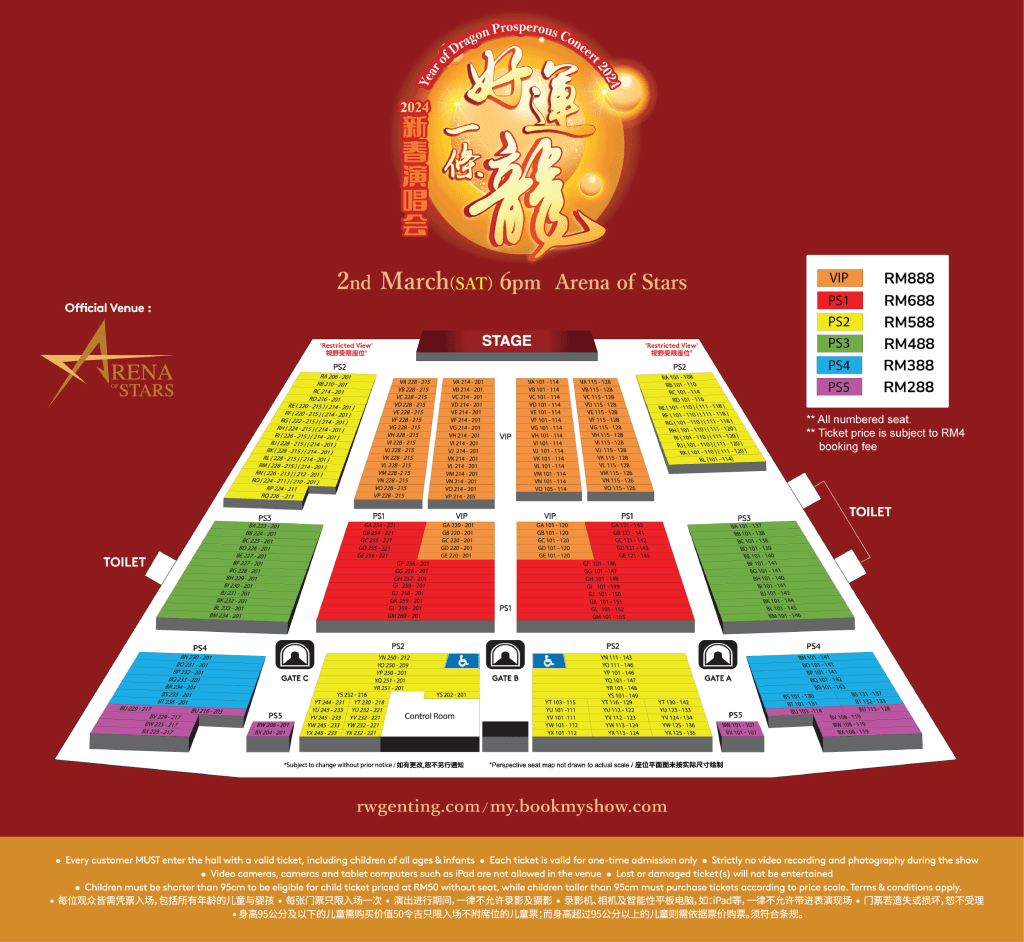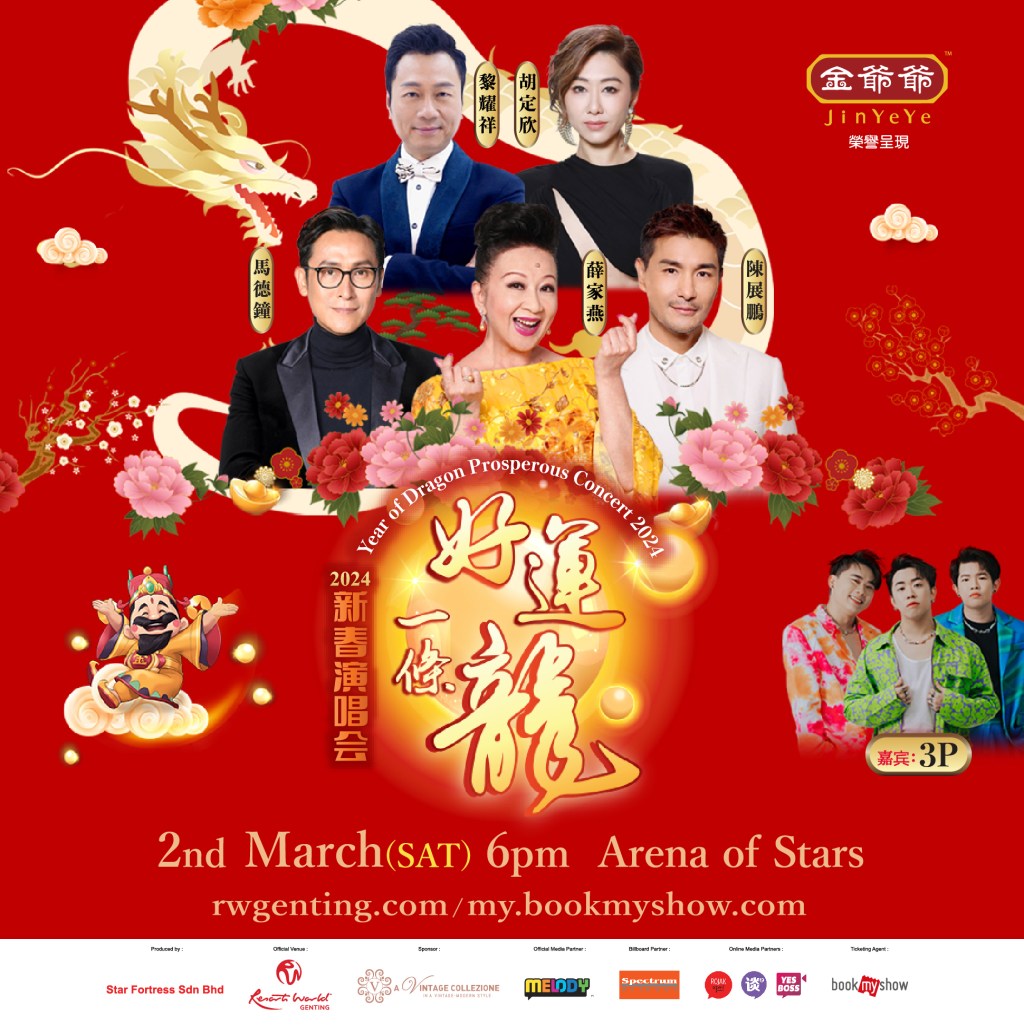 由金爷爷荣誉呈现《好运一条龙新春演唱会2024》将于3月2日,傍晚6时,云顶世界云星剧场隆重引爆,演唱会门票票价分为888令吉(VIP)、688令吉 (PS1)、588令吉(PS2)、488令吉(PS3)、388 令吉(PS4)及288令吉(PS5),(门票不包括4令吉手续费)。