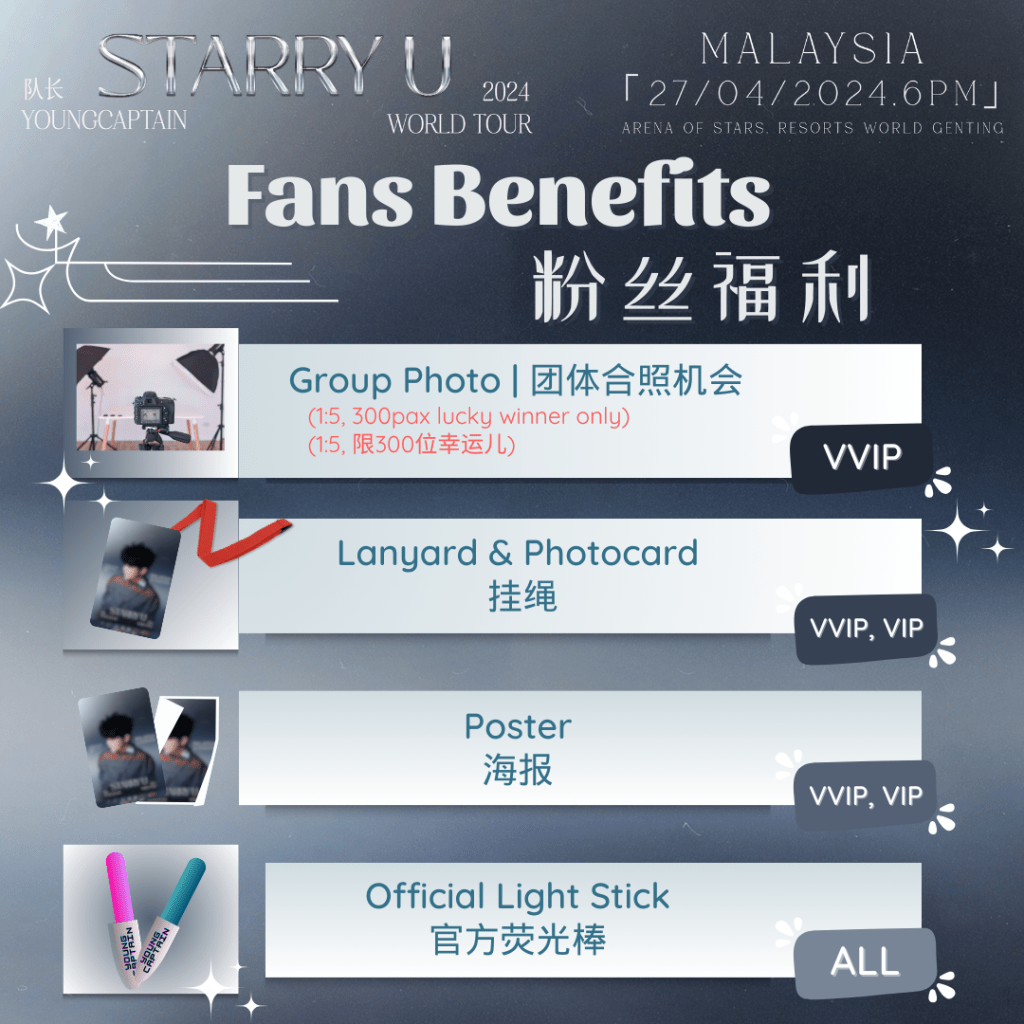 阔别11个月,队长定档4月空降大马展开特别行动,以全新主题带来<STARRY U>2024世界巡演首站马来西亚演唱会,回馈给一直以来力挺他的歌迷!本次<STARRY U>世界巡演意为“星光璀璨,为你而来”。除了全新升级,精心设计的音乐盛宴,更是有环节安排、灯光视效等等诸多提升和惊喜,将继续引领粉丝走进队长创意无限的音乐世界。