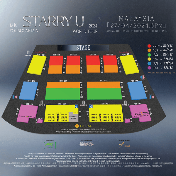 票价: RM668(VVIP)、RM568(VIP)、RM468(PS1)、RM388(PS2)、RM288(PS3)、RM188(PS4)