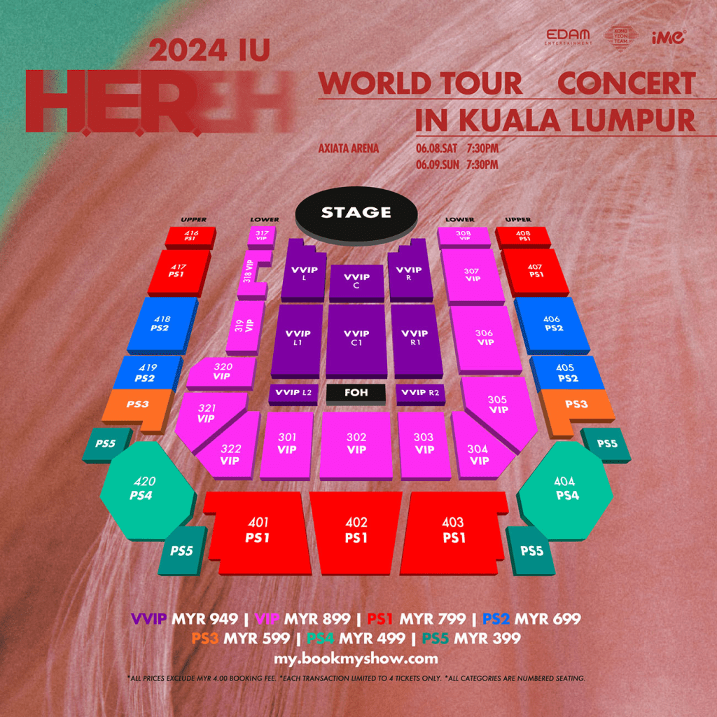 票价: (VVIP) MYR949 / (VIP) MYR899 / (PS1) MYR799 / (PS2) MYR699 / (PS3) MYR599 / (PS4) MYR499 / (PS5) MYR399