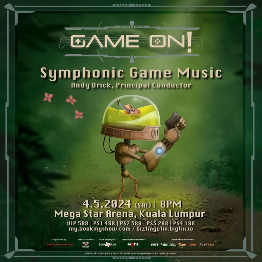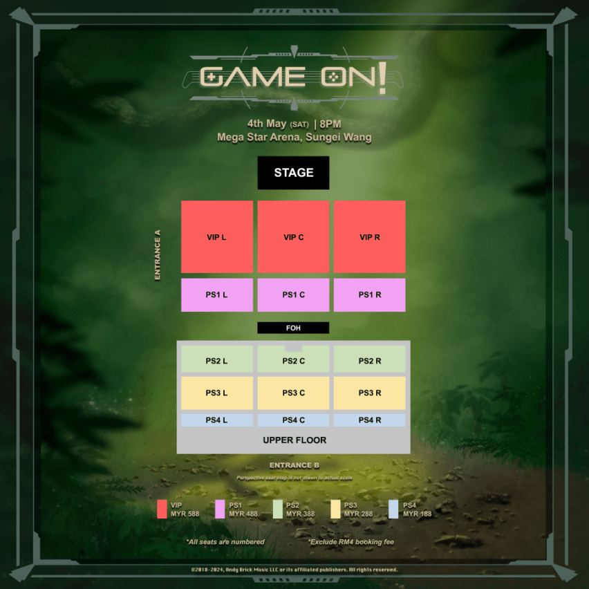 《Game ON!》演奏会将于2024年5月4日(星期六),晚上8时在 Mega Star Arena 盛大举行,门票将于4月6日上午11点开始发售! 票价分为RM588 (VIP)、RM488 (PS1)、RM388 (PS2)、RM288 (PS3) 和RM188 (PS4).