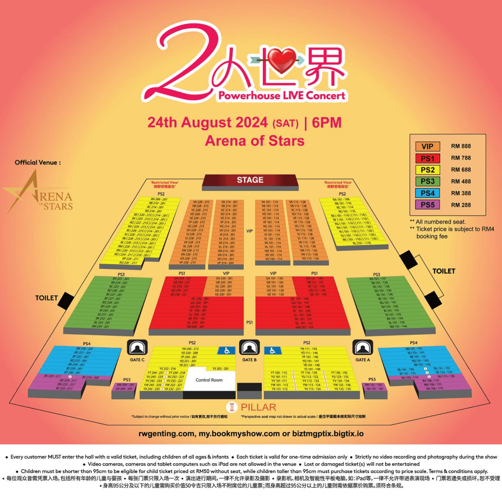 票价:RM888(VIP)、RM788(PS1)、RM688(PS2)、RM488(PS3)、RM388(PS4)、RM288(PS5)