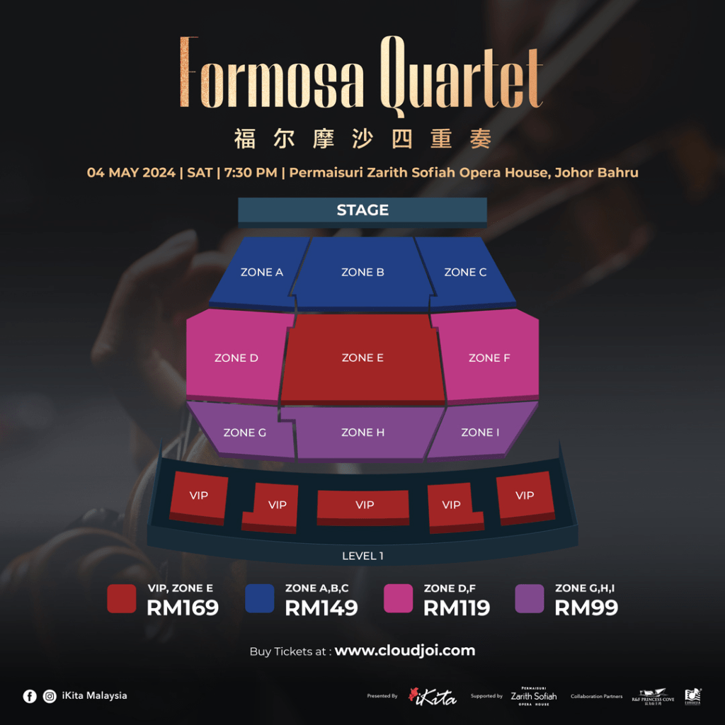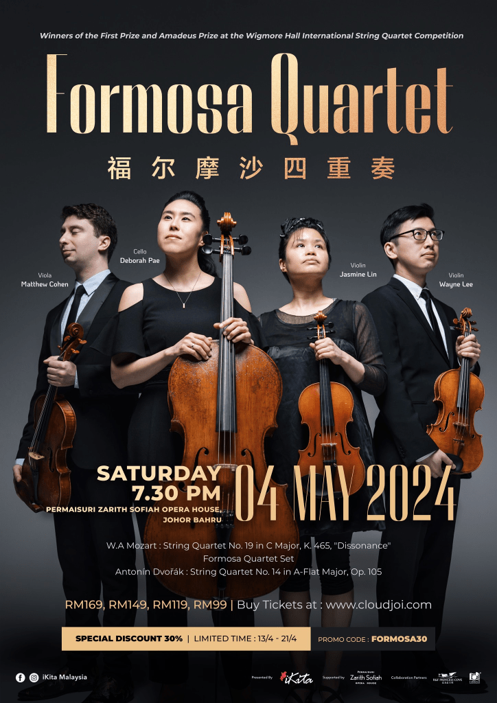 由iKita Malaysia主办,荣获第十届伦敦国际弦乐四重奏大赛首奖及阿玛迪斯奖的福尔摩沙四重奏即将于5月4日首次登上马来西亚舞台。