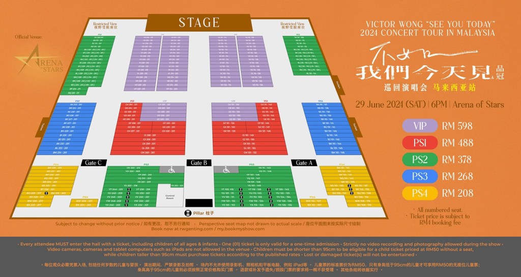 票价:RM598 (VIP)、RM488 (PS1)、RM378 (PS2)、RM268 (PS3)、RM208 (PS4)