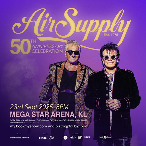 柔情摇滚传奇 Air Supply 将于 2025年9月23日(星期二)重返吉隆坡,带来他们成军50週年的世界巡演演出。这是继2015年40週年纪念演出後,Air Supply 相隔十年再次踏上吉隆坡的舞台。Graham Russell 与 Russell Hitchcock 将以一首首深情经典,唤起几代人共同的珍贵回忆!