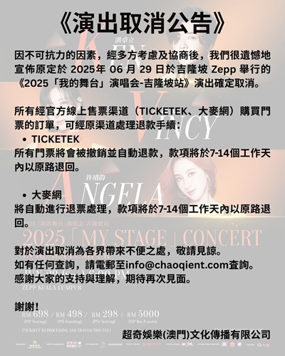 可惜主办超奇娱乐(澳门)文化传播有限公司今日宣布,因不可抗力的因素,经多方考虑及协商后,此演唱会确定取消,敬请见谅。