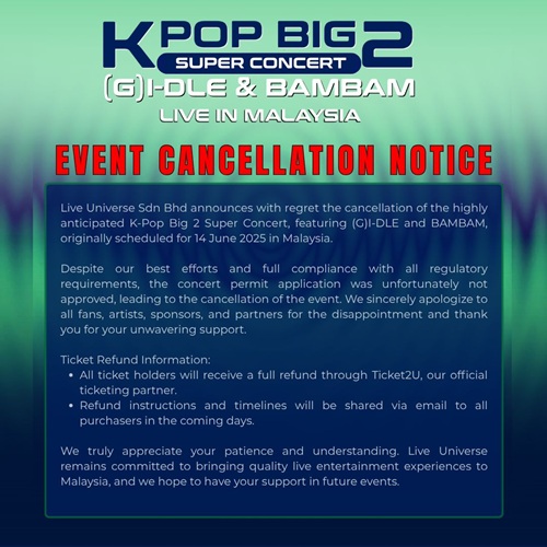 主办方Live Universe Sdn Bhd今日发文,宣布原定于 2025年6月14日 在马来西亚举行的 KPOP BIG 2 SUPER CONCERT,由于演唱会许可申请未被批准,很遗憾地宣布活动被取消。