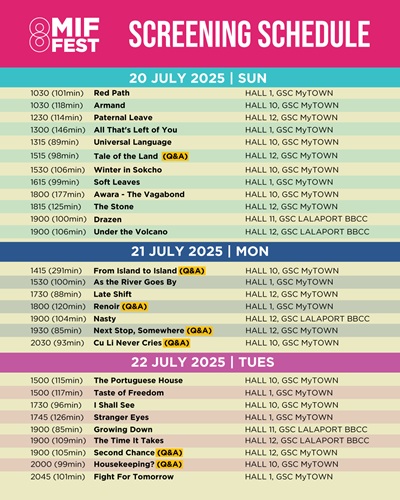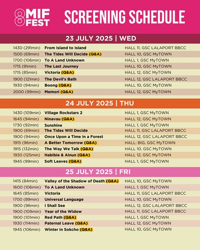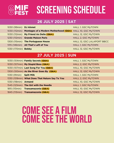 第八届马来西亚国际电影节(MIFFest)正式揭晓官方放映时间表,邀请全球影迷踏上一场跨越文化与创意的银幕之旅。本届电影节将在 GSC MyTOWN KL 及 GSC Lalaport BBCC 举行,设有室内与露天放映,展映来自48个国家、共65部电影,打造前所未有的观影体验。