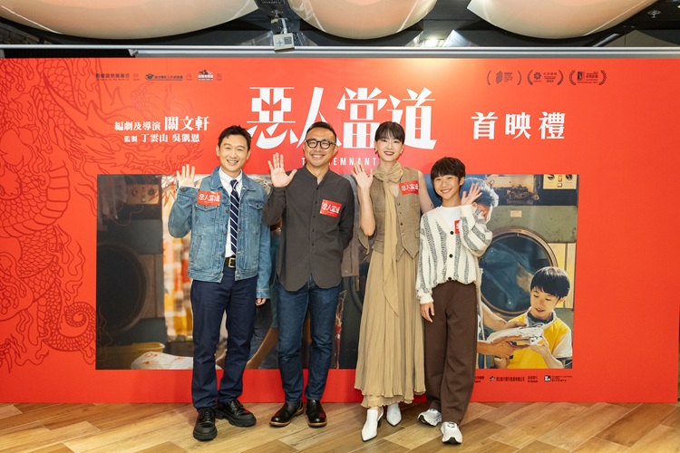 (左起)凌文龙、关文轩导演、廖子妤、童星苏天乐出席《恶人当道》香港首映礼。