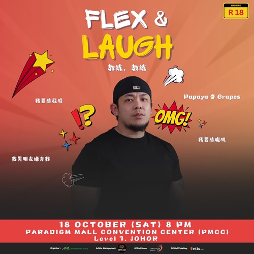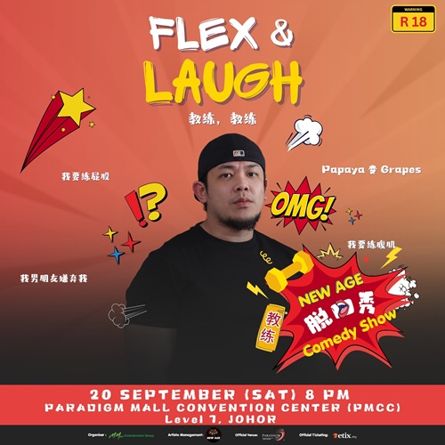 由 MMIC 娱乐主办的《New Age “Flex & Laugh” Comedy Show》脱口秀,将于9月20日(星期六) 在柔佛新山Paradigm Mall Convention Center, Level 7以及9月27日(星期六) 在槟城 Auditorium Tun Dr Lim Keng Yaik, Level 5 Wawasan Open University晚上八时爆笑登场。