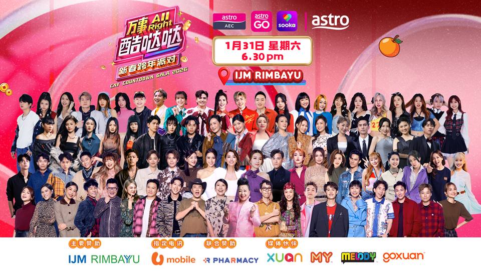 Astro《万事All Right酷哒哒新春跨年派对》将于1月31日(星期六)傍晚6时30分起免费开放入场,在IJM RIMBAYU隆重举行,与全民一起倒数迎新年。