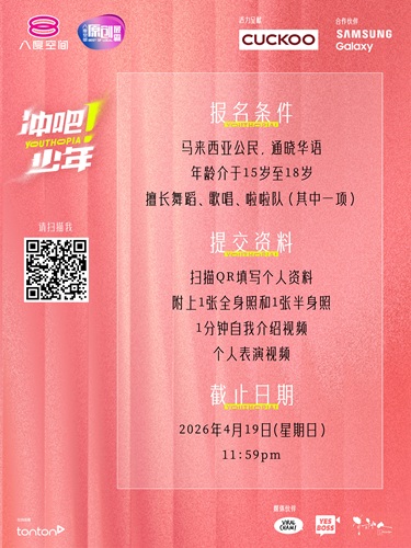 《冲吧!少年》现已向全马少年发出召集令。本次招募涵盖三大领域,包括擅长舞蹈的街舞少年、具个人特色与创作能力的唱将,以及敢于挑战高难度动作的啦啦队精英。凡年龄介于15至18岁、勇于表达自我的少年,均可报名参与,争取加入节目的机会。