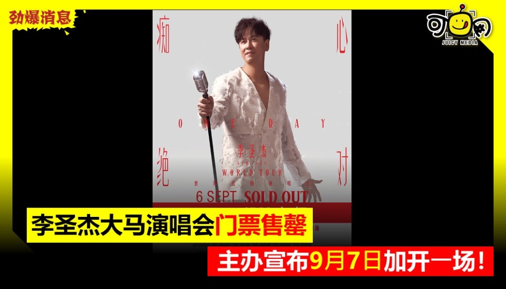 李圣杰大马演唱会⻔票售罄,主办宣布 9 ⽉ 7 ⽇加开⼀场!