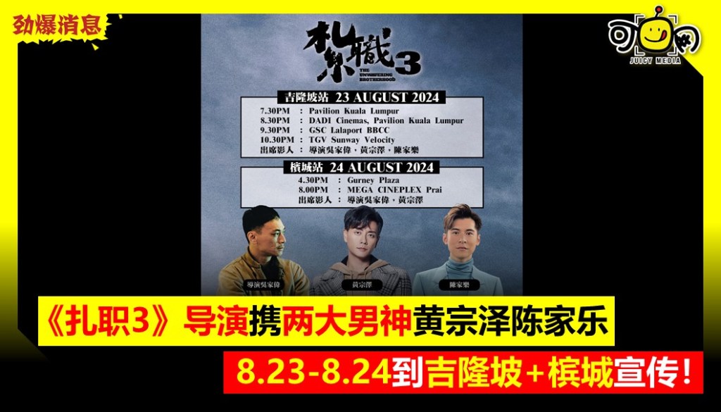 《扎职3》导演携两大男神黄宗泽、陈家乐,8.23-8.24到吉隆坡+槟城宣传!