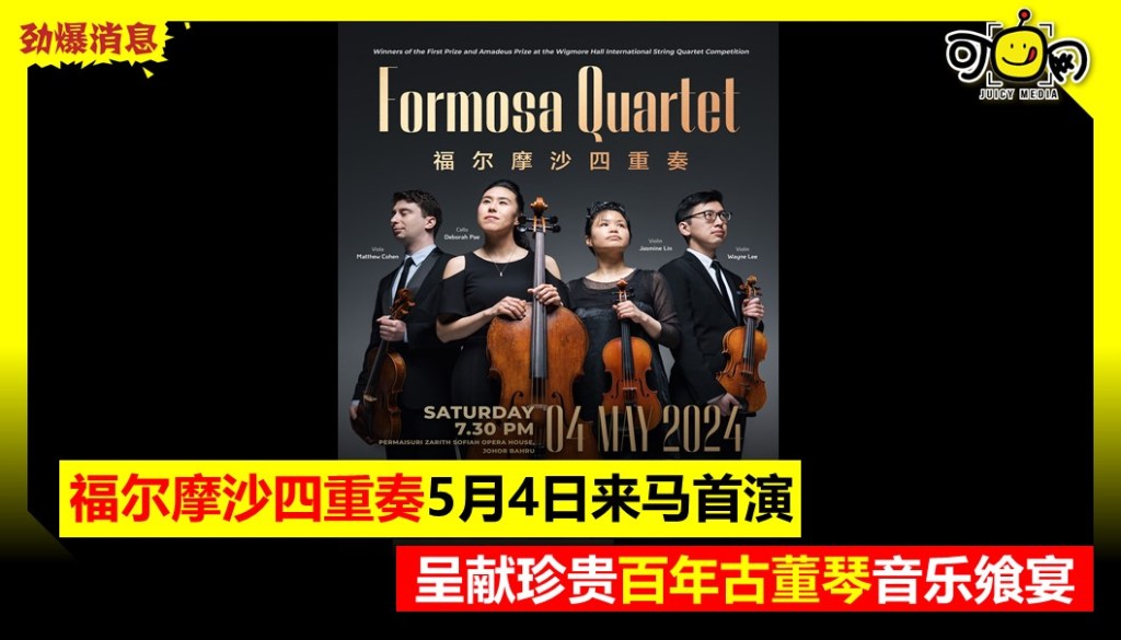 福尔摩沙四重奏5月4日来马首演,呈献珍贵百年古董琴音乐飨宴